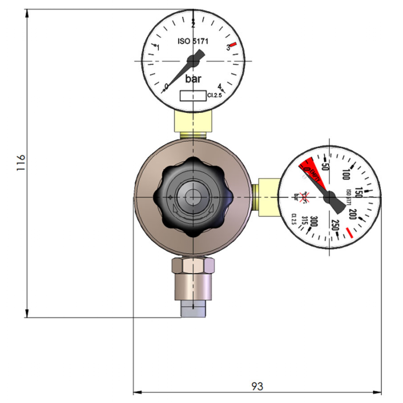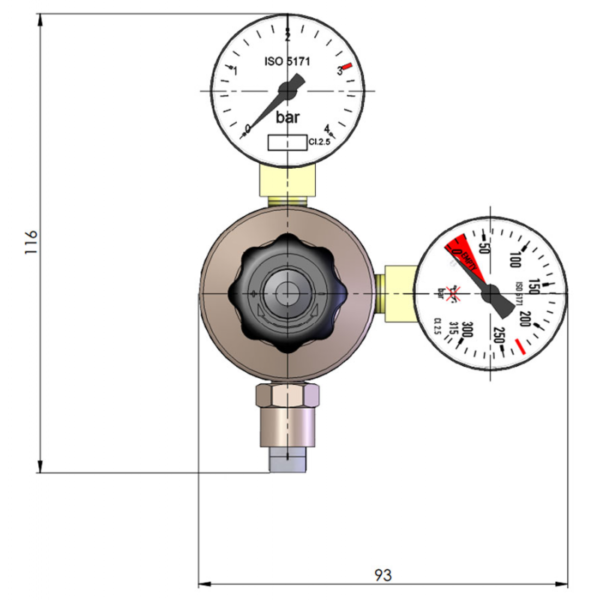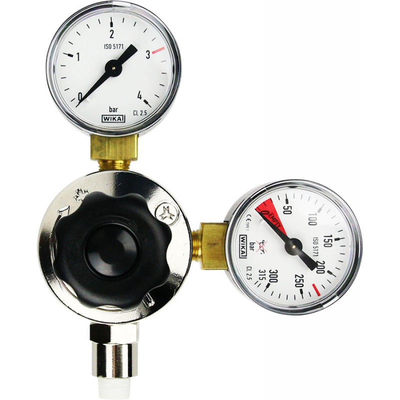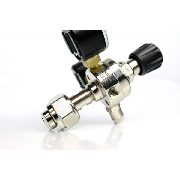 Na reduktorze ( prawy manometr ) polecamy ustawić ciśnienie rzędu 10 – 20 Bar i doregulować osobno wpiętym w układ Co2 – zaworkiem precyzyjnym np. marki Camozzi